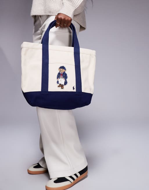 Polo Ralph Lauren - Cremehvid tote-taske med marineblå stropper og bjørnelogo