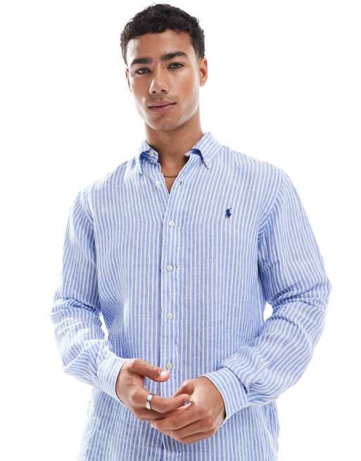 Polo Ralph Lauren - Figursyet hørskjorte med ikonlogo og blå/hvide striber