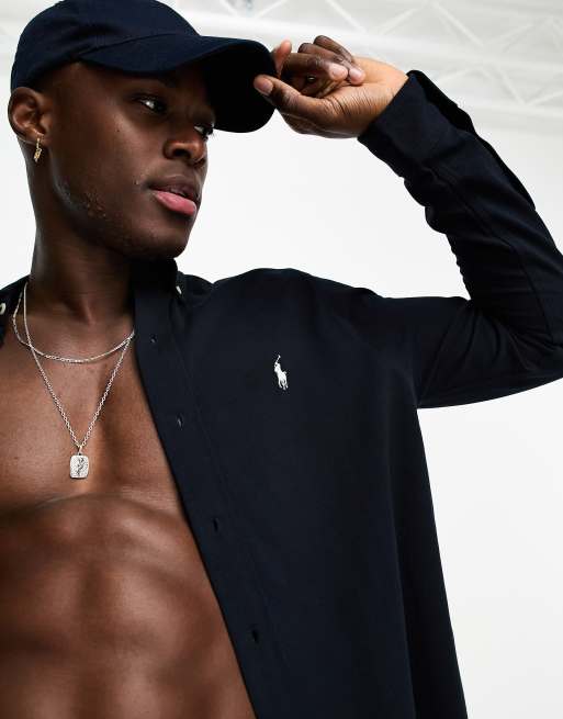 Polo Ralph Lauren - Marineblå piqué-skjorte med knapper og ikonlogo