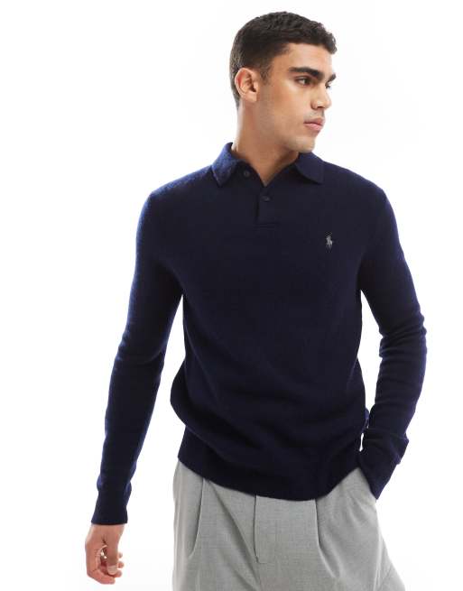 Polo Ralph Lauren - Marineblå strikket polo med lange ærmer og ikonlogo i bomuld- og uldblanding