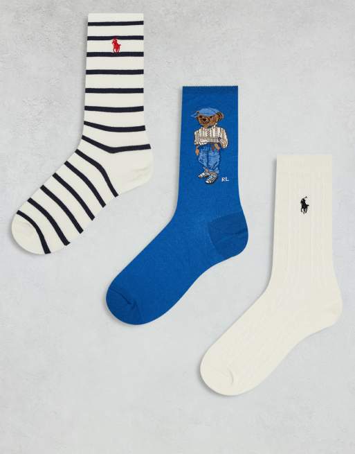Polo Ralph Lauren - Pakke med 3 par blå/cremehvide sokker med kabelstrikkede detaljer, bjørnemotiv og striber