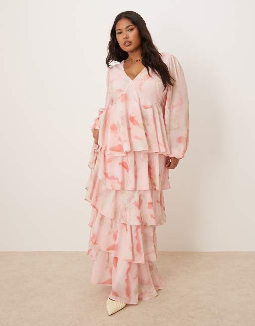 Pretty Lavish Curve - Langærmet maxikjole med flæser og pink og brunt ombré-print