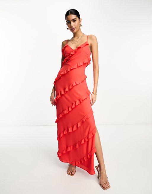 Pretty Lavish - Rubinrød asymmetrisk maxikjole med flæser