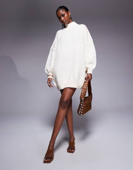 Princess Polly - Beige strikket sweater-minikjole med høj hals og ballonærmer
