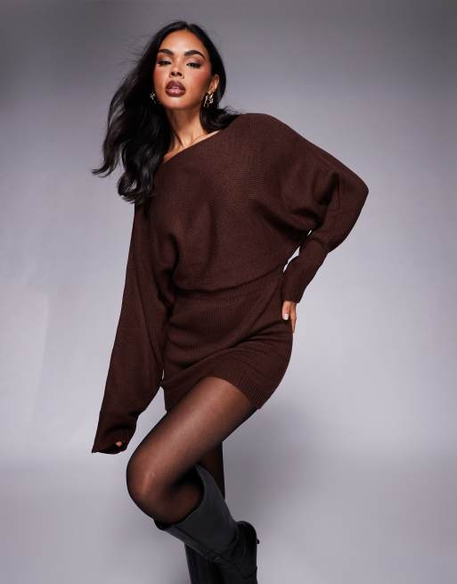Princess Polly - Bellamie - Chokoladebrun sweaterkjole med ballonærmer og fold i taljen