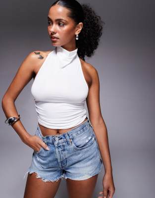 Princess Polly - Giggle - Hvid stramtsiddende halterneck-top med høj hals og vandfaldsudskæring