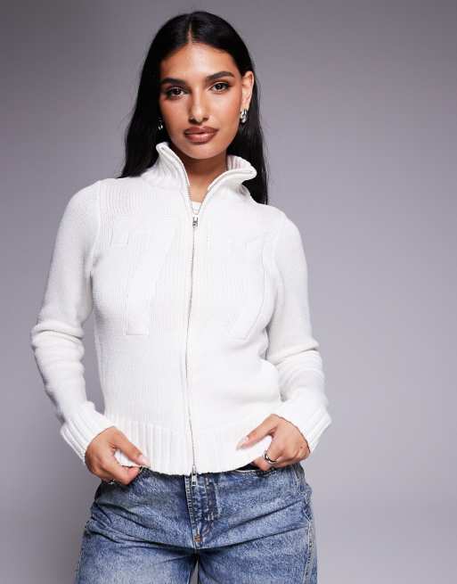 Princess Polly - Hvid ribstrikket cardigan med høj hals og gennemgående lynlås