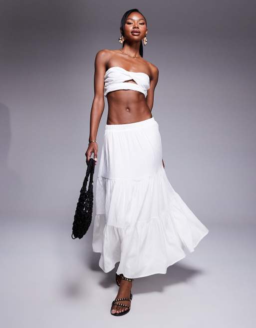 Princess Polly - Hvidt sæt med croptop med bandeau-snit og snoning foran og lagdelt maxinederdel