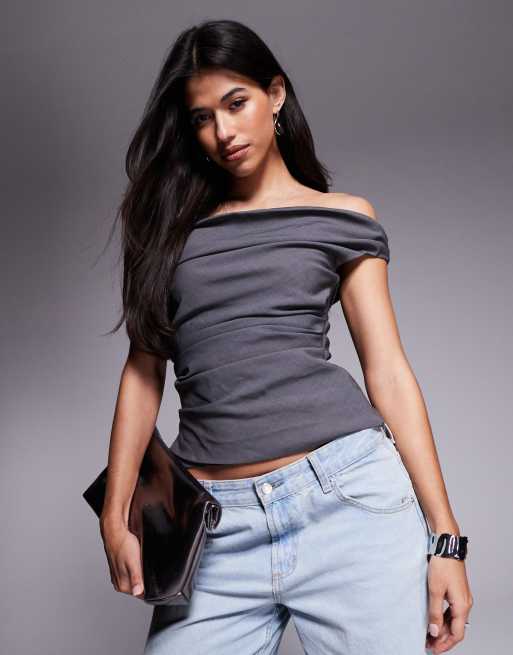 Princess Polly - Koksgrå og rynket bardot-top med draperede detaljer