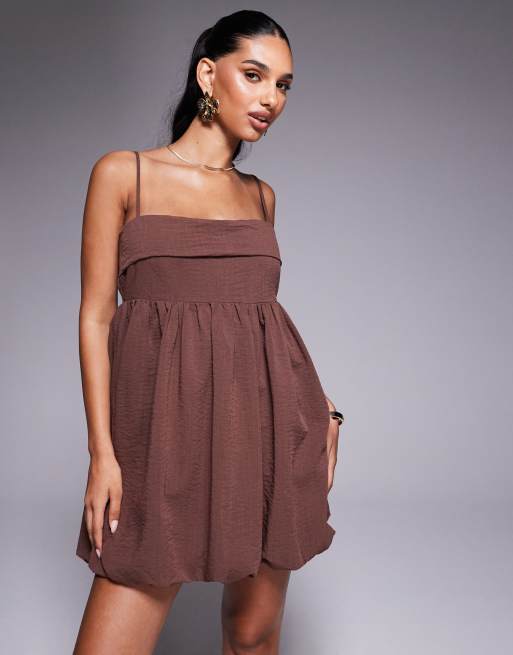Princess Polly - Layken - Brun puffball-minikjole med cami-stropper, firkantet hals og foldet kant