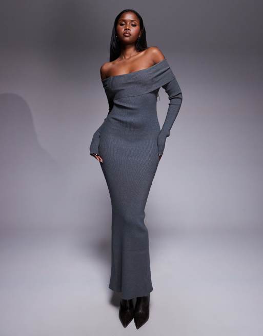 Princess Polly - Phylis - Koksgrå ribstrikket maxikjole med bardot-snit med foldet detalje og slids bagpå