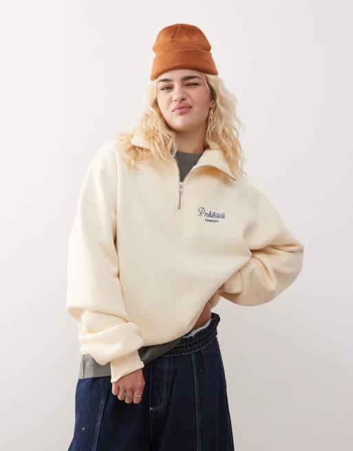 Prohibited - Cremehvid sweatshirt med halv lynlås og kontrasterende logodetalje