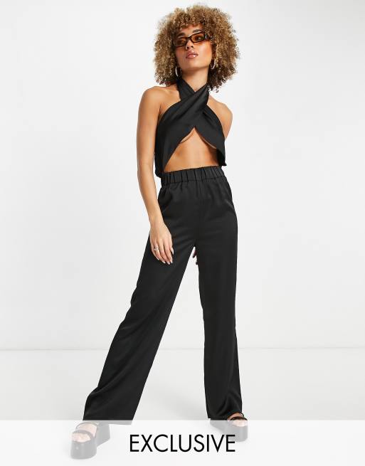 Public Desire - Sort strand-jumpsuit med slå-om-front i satin