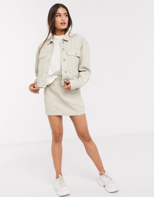 Pull&Bear - Beige sæt med denimjakke og nederdel