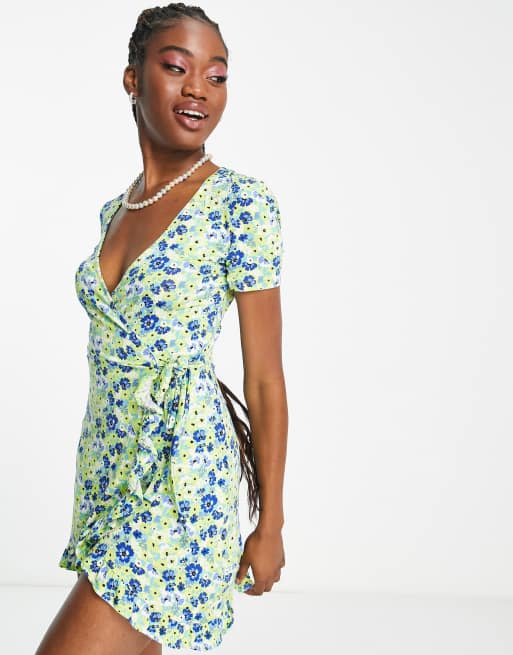 Pull&Bear - Blå minikjole med slå-om-front og blomstermønster