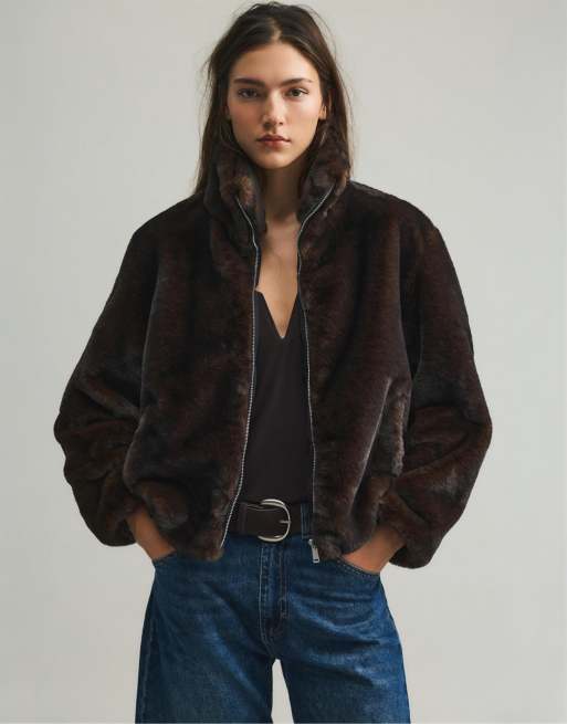 Pull&Bear - Brun jakke med høj hals i imiteret pels