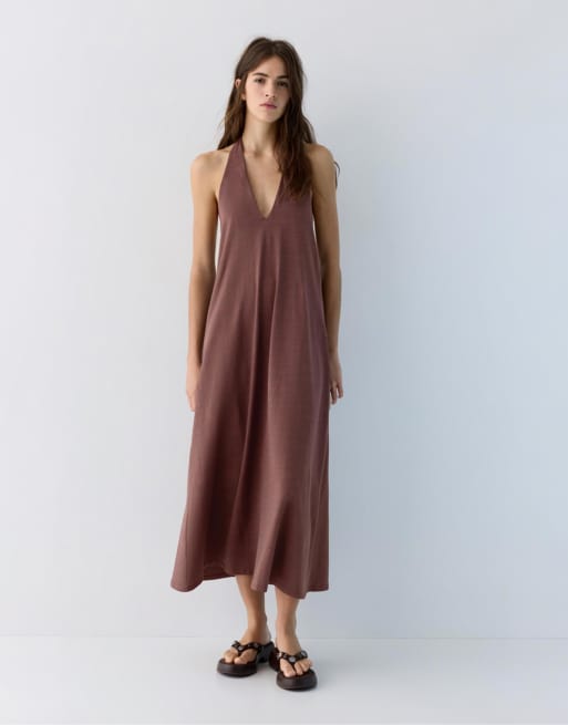 Pull&Bear - Brun midikjole med halterneck