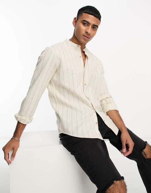 Pull&Bear - Brun skjorte med grandad-striber i hør
