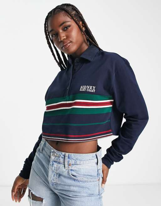 Pull&Bear - Cropped poloskjorte med striber i marineblå