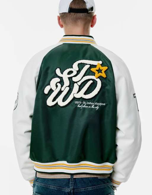 Pull&Bear - Flaskegrøn bomber-jakke med college-design og broderi