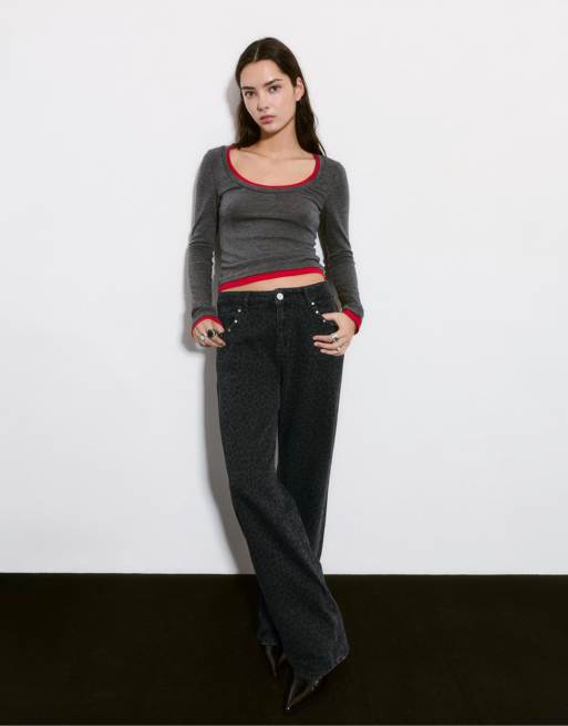 Pull&Bear - Grå jeans med nitter og leopardprint