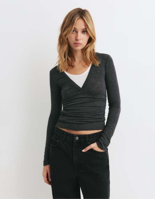 Pull&Bear - Grå T-shirt med dobbelt V-hals