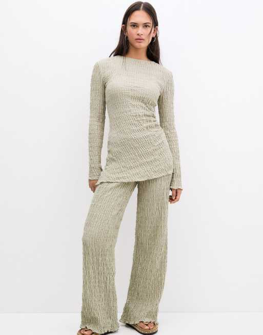 Pull&Bear - Grøn top med lange ærmer, rynker og flæser