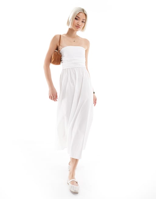Pull&Bear - Hvid midaxi-kjole med rynket detalje og bandeau-snit i poplin