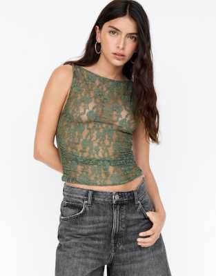 Pull&Bear - Kakigrøn top med rynker i siderne i blondestof