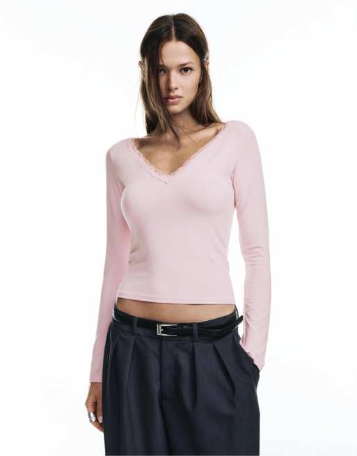 Pull&Bear - Lyserød T-shirt med halsudskæring med blondekant