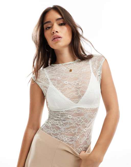 Pull&Bear - Mintgrøn bodystocking med korte ærmer i blondestof