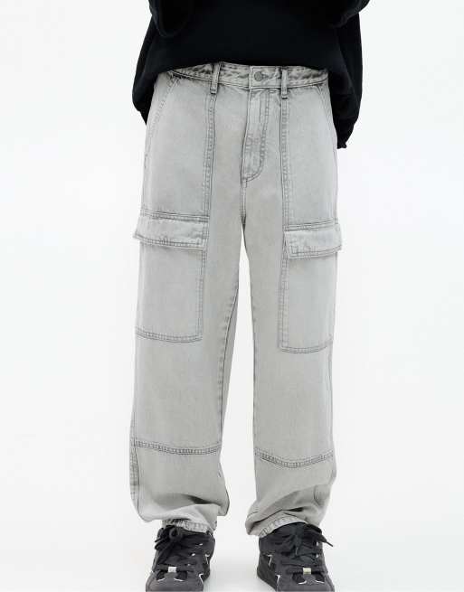 Pull&Bear - Mørkegrå cargo-jeans i poset pasform