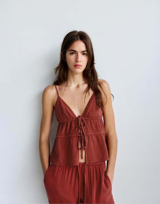 Pull&Bear - Rødbrun top med tekstur og stropper