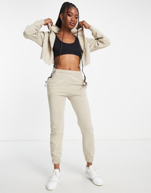 Pull&Bear - Sandfarvet sæt med cropped hættetrøje med lynlås og joggingbukser