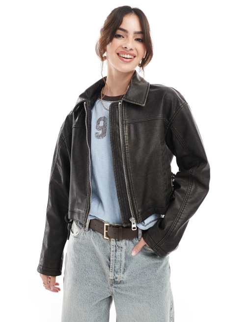 Pull&Bear - Sort jakke med bindebåndsdetalje i imiteret læder i westernstil