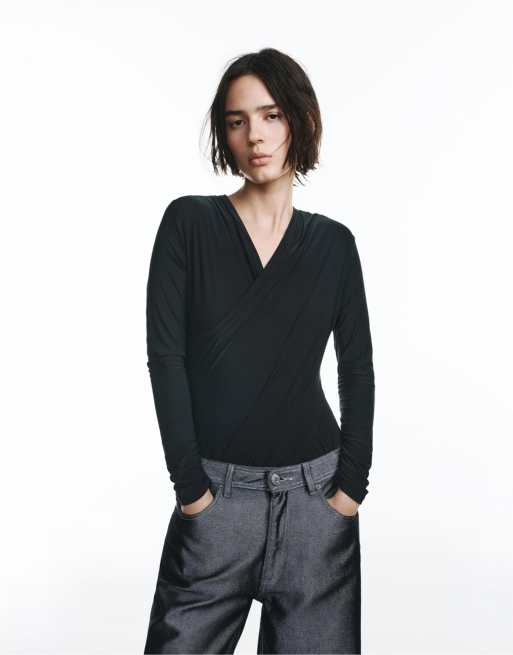 Pull&Bear - Sort og langærmet bodystocking med slå om-detalje i halsen