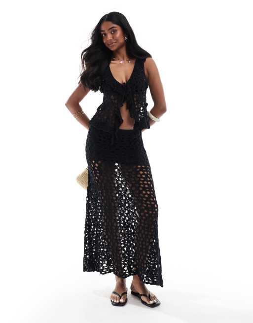 Pull&Bear - Sort strikket midinederdel med hæklet look - Del af sæt