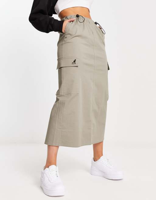 Pull&Bear x Kangol - Cargo-midinederdel med løbesnore i khaki