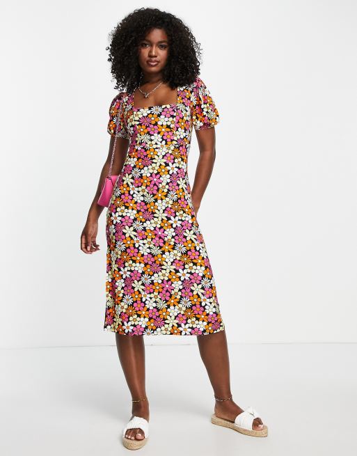 QED London - Blød midikjole med firkantet hals og 70'er-inspireret blomstermønster