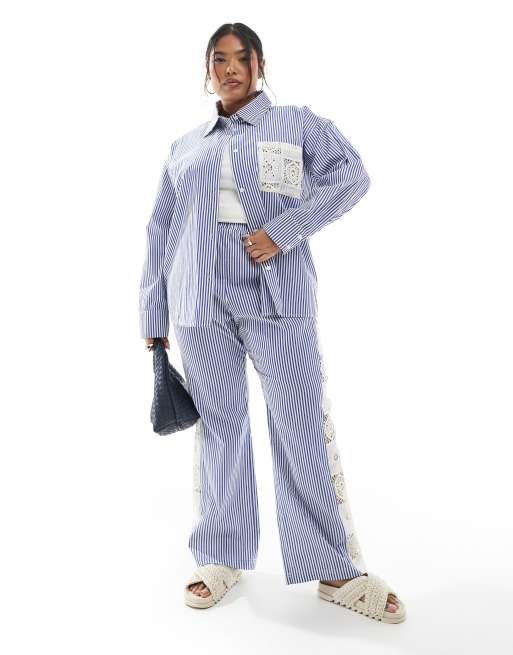 Renée Studio - Blåt og hvidt sæt med skjorte med hæklet lommedetalje og bukser med striber - Kun hos ASOS
