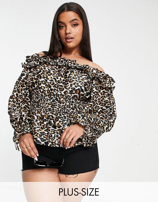 River Island Plus - Bardot-bluse med rynket talje og dyreprint