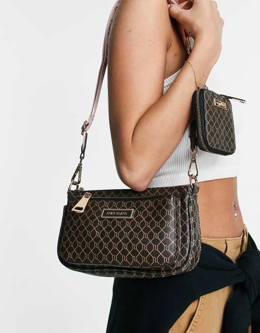 River Island - Dobbeltpung-taske med monogram i brun