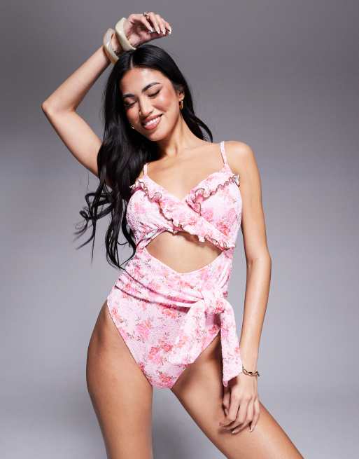 River Island - Lyserød slå-om-badedragt med broderi og småprint