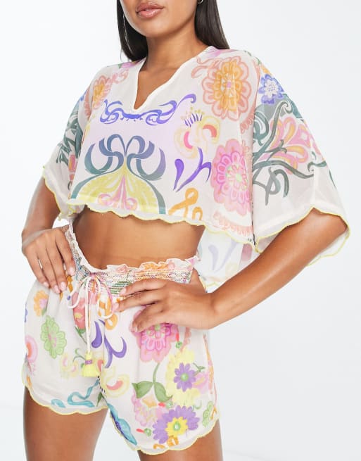 River Island - Lyserødt sæt med broderet kimono crop-strandtop og shorts