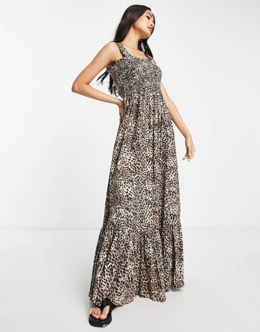 River Island - Sort maxikjole med flæser og rynkede stropper i leopardprint