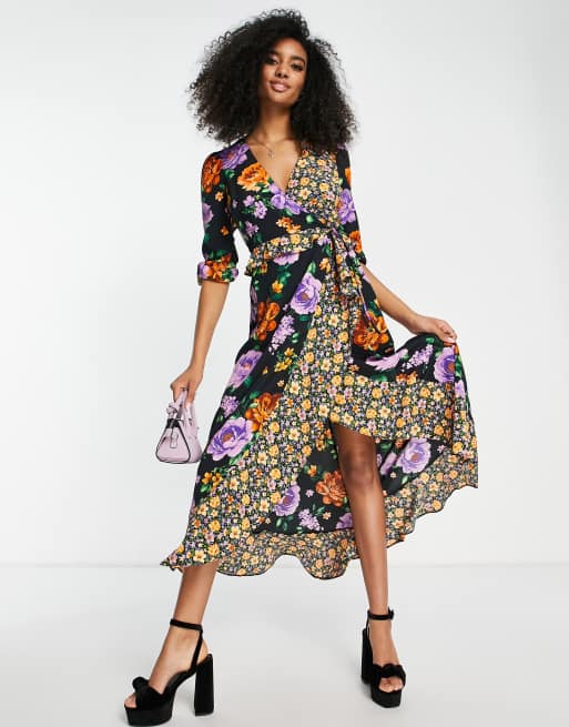 River Island - Sort slå-om-midikjole med blandet blomstermønster