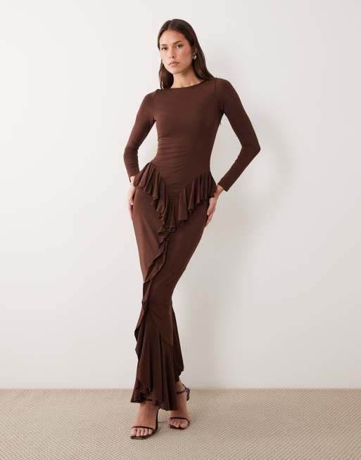 Ruched & Ready - Mørk chokoladebrun formende langærmet maxikjole med draperede flæsedetaljer