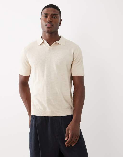 Selected - Cremehvid polo i hørblanding med slids i halsen