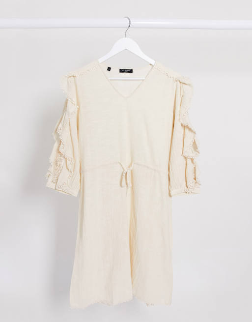 Selected Femme - Cremefarvet minikjole med flæseærmer og bindebånd i taljen