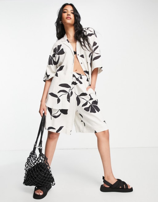 Selected Femme - Sæt med resort-skjorte og shorts i hørblanding med sort/hvidt print